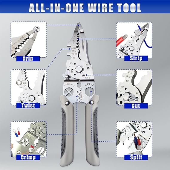 ব্যবহারিক মাল্টি-ফাংশন টুল: তারের কাটা, স্ট্রিপিং, ক্রাইম্পিং, উইন্ডিং, স্প্লিটিং, ক্ল্যাম্পিং এবং রেঞ্চিং এর মতো বিভিন্ন ইলেকট্রিশিয়ান অপারেশন প্রয়োজনীয়তা পূরণ করে